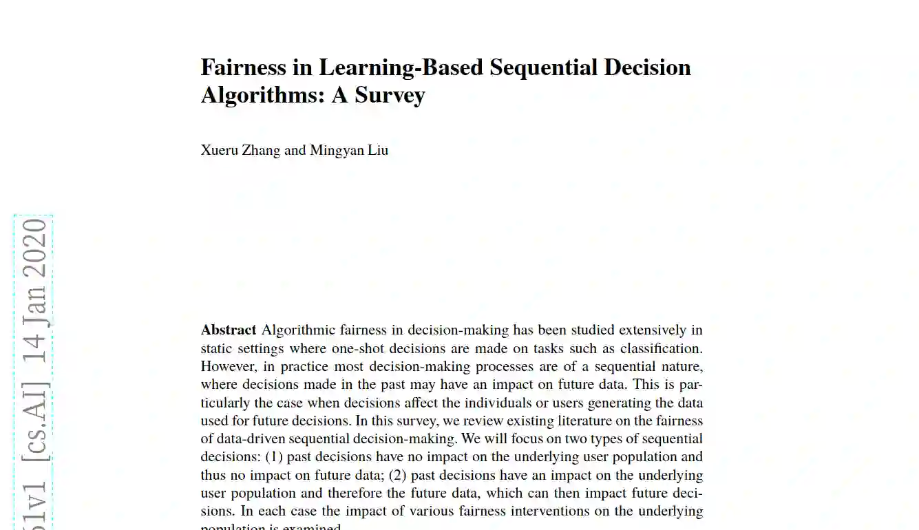 基于学习的序列决策算法的公平性综述论文,Fairness in Learning-Based Sequential Decision Algorithms: A Survey