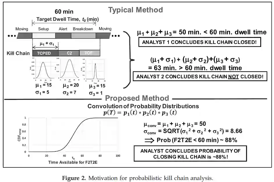 本文提出了一种鞍点近似法的应用,用于量化空对地杀伤链中“发现、锁定、跟踪、瞄准和交战”步骤在给定截止时间T内完成的概率,其中F2T2E每个步骤以及截止时间T均可被建模为具有已知或估计概率分布的独立随机变量。这使得我们能够确定,一个由特定传感器、通信链路和武器飞行时间构成的给定杀伤链是否能够及时闭合,从而对可重定位目标构成威胁,其中目标的停留时间分布代表了目标处于脆弱状态时间的不确定性。以往的方法常对这些步骤使用固定的时间估算,因而忽略了每个杀伤链步骤的时间变异性以及目标脆弱时间的不确定性。此外,本文开发的闭合形式近似法能够解析地洞察杀伤链对各参数变化的敏感性。与卷积概率分布的其他方法(例如蒙特卡洛方法)相比,其计算速度也更快。