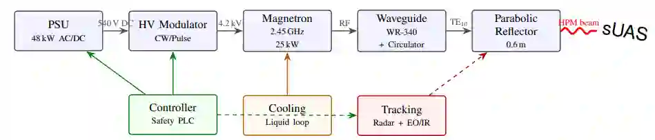 在自主导航下运行的小型无人航空系统的扩散,催生了对能够免疫于传统射频干扰的非动能压制手段的迫切需求。本文提出了一个全面的多物理场仿真框架,用于设计和评估一个工作频率为2.45 GHz的高功率微波反无人机系统。该框架集成了电磁传播建模、天线方向图分析、电磁耦合到无屏蔽无人机线缆的仿真,以及一个根据已发表的CMOS闩锁阈值校准的、基于S型函数的半导体损伤概率模型。一个包含发射机功率、天线指向误差、目标线缆方向、极化失配和元件损伤阈值随机变化的10,000次蒙特卡洛分析,得出了具有95%置信区间的系统级毁伤概率。对于一个基准配置(25 kW连续波功率,60 cm抛物面反射器,增益21.2 dBi),蒙特卡洛仿真预测在20米处的毁伤概率为51.4 ± 1.0%,在40米处则降至13.1 ± 0.7%。在500 kW峰值功率、1%占空比的脉冲工作模式下,可将90%毁伤概率的作用距离从约18米延伸至88米。该框架进一步提供了参数化设计图、符合ICNIRP 2020指南的安全禁区计算、热管理要求以及波导模式分析。所有仿真代码和结果均已提供,以确保完全可复现性。