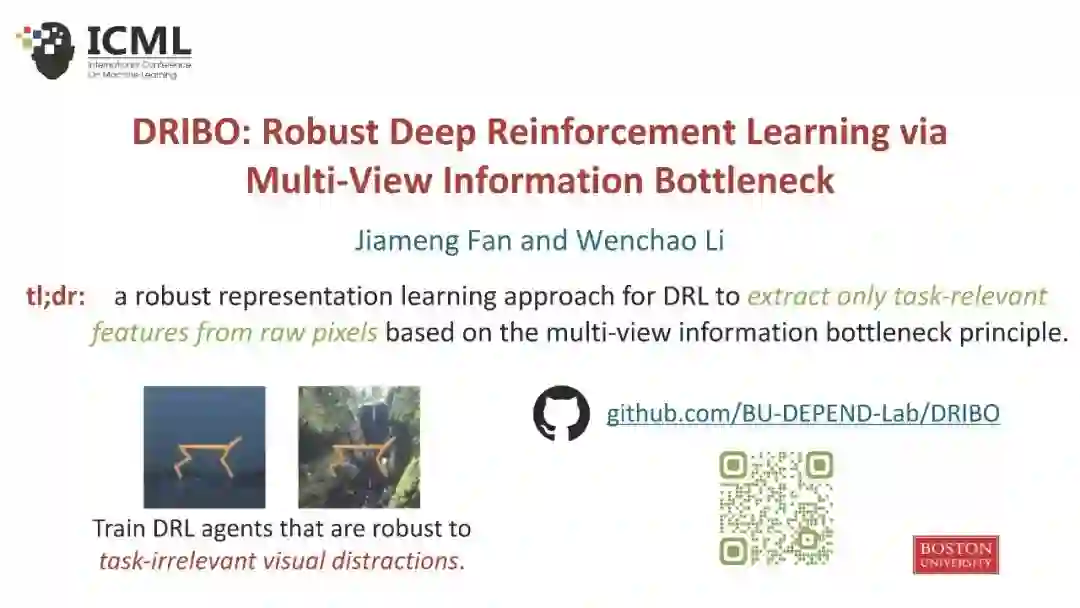 深度强化学习(DRL)智能体通常对其训练环境中看不到的视觉变化敏感。为了解决这个问题,我们利用RL的顺序特性来学习稳健的表示,这种表示只编码来自基于无监督多视图设置的观察的任务相关信息。具体地说,我们为时间数据引入了一个新的多视图信息瓶颈(MIB)目标的对比版本。我们用这个辅助目标从像素训练RL智能体来学习鲁棒的表示,它可以压缩与任务无关的信息,并可以预测与任务相关的动态。这种方法使我们能够训练出高性能的策略,这些策略能够抵御视觉干扰,并能够很好地推广到看不见的环境中。我们证明,当背景被自然视频取代时,我们的方法可以在DeepMind控制套件中不同的视觉控制任务集上实现SOTA性能。此外,我们还展示了在Procgen基准测试中,我们的方法优于已建立的基线,可以泛化到看不见的环境。我们的代码是开源的,可以在https://github上找到。com/BU-DEPEND-Lab/DRIBO。