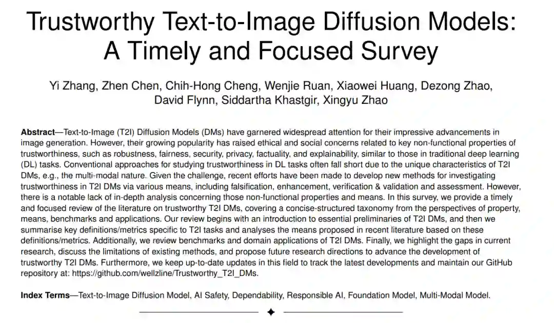 摘要—文本到图像 (T2I) 扩散模型 (DMs) 因其在图像生成方面的显著进展而受到广泛关注。然而,随着其日益普及,与信任度的关键非功能性属性相关的伦理和社会问题也日益凸显,例如鲁棒性、公平性、安全性、隐私性、事实性和可解释性,这些问题与传统深度学习 (DL) 任务中的类似问题相似。由于 T2I DMs 的独特特性,例如其多模态性,传统的研究深度学习任务信任度的方式往往不足以应对这些问题。鉴于这一挑战,近年来一些新方法被提出,通过伪造、增强、验证与确认以及评估等多种方式来研究 T2I DMs 的信任度。然而,关于这些非功能性属性和方法的深入分析仍然相对缺乏。在本次调研中,我们对可信的 T2I DMs 文献进行了及时且重点突出的回顾,涵盖了从属性、手段、基准和应用等角度构建的简明分类结构。我们的调研首先介绍了 T2I DMs 的基本知识,随后总结了 T2I 任务特有的关键定义/指标,并基于这些定义/指标分析了最新文献中提出的研究手段。此外,我们还回顾了 T2I DMs 的基准测试和领域应用。最后,我们指出了当前研究中的空白,讨论了现有方法的局限性,并提出了未来研究方向,以推动可信 T2I DMs 的发展。此外,我们还通过我们的 GitHub 仓库(https://github.com/wellzline/Trustworthy-T2I-DMs)保持领域最新进展的更新。 关键词—文本到图像扩散模型,人工智能安全,可靠性,负责任的人工智能,基础模型,多模态模型。
