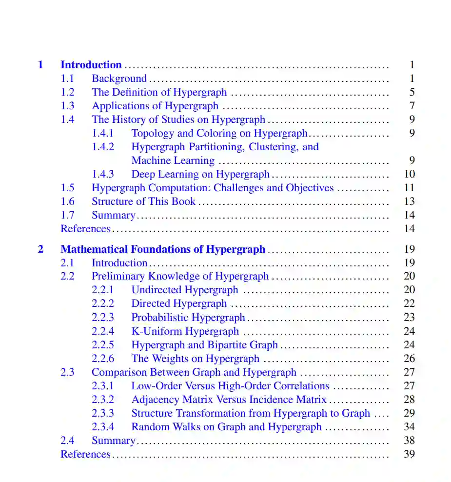 这本开放获取的书籍讨论了超图计算的理论和方法。许多数据之间的底层关系可以用图表来表示,例如在计算机视觉、分子化学、分子生物学等领域。在过去的十年中,人们开发了基于图的学习和神经网络方法来处理这类数据,它们特别适合处理关系学习任务。然而,在许多实际问题中,我们关心的对象之间的关系比两两之间的关系更复杂。简单地将复杂的关系压缩为两两的关系必然会导致信息的丢失,这些信息对于学习任务来说可以预期是有价值的。超图作为图的一种延伸,已经显示出与图相比在建模复杂关系方面的优越性能。近年来,超图相关的AI方法的研究越来越受到欢迎,这些方法已经被用于计算机视觉、社交媒体分析等。我们将这些尝试总结为一种新的计算范式,称之为超图计算,其目标是使用超图来表述数据底层的高阶关联,然后针对不同的应用在超图上进行语义计算。这本书的内容包括超图计算范式、超图建模、超图结构演化、超图神经网络以及超图计算在不同领域的应用。我们在这本书中进一步总结了超图计算的近期成就和未来的发展方向。