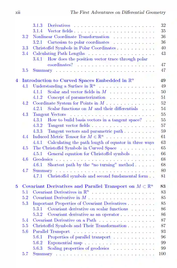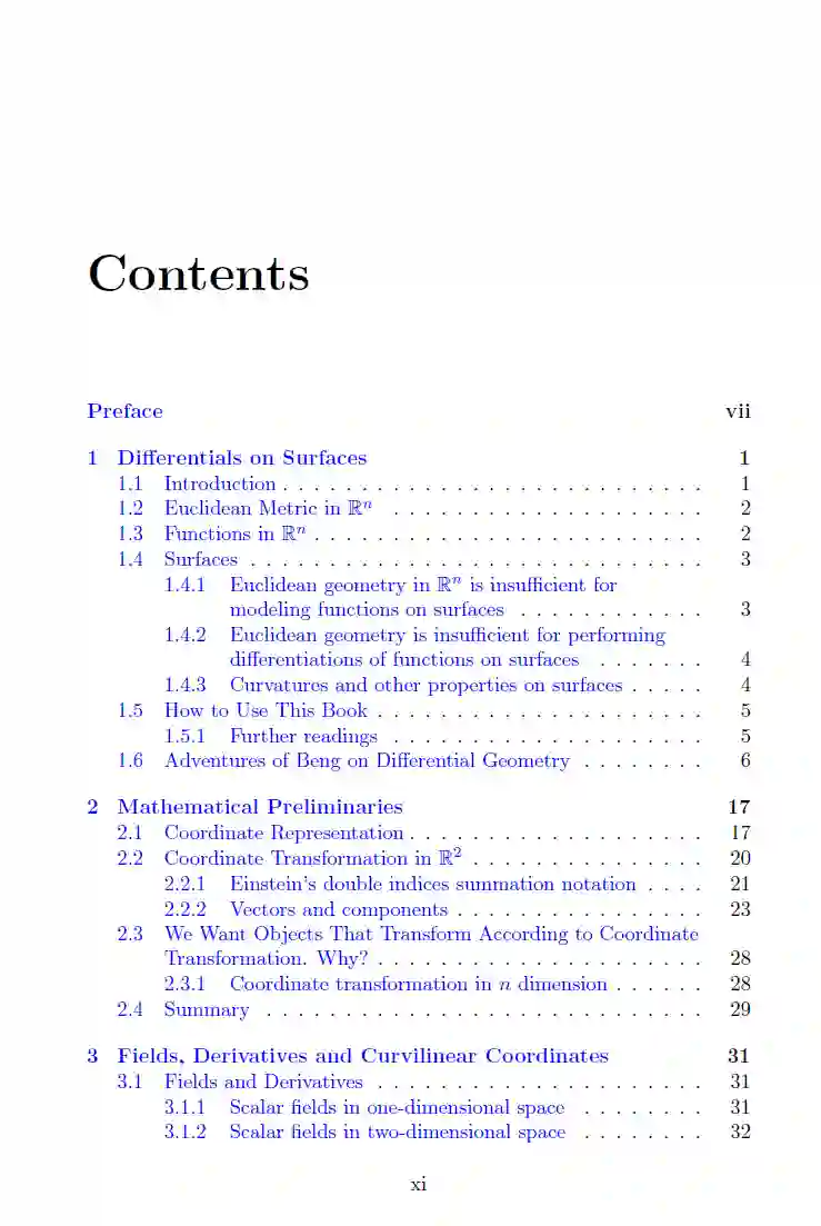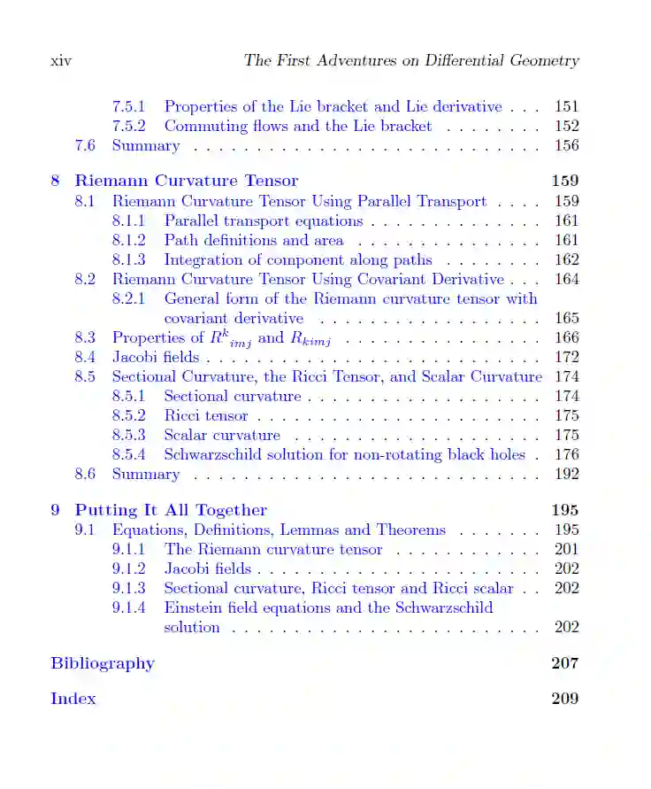这本书为希望开始学习微分几何的读者提供了一个友好的入门平台。它奠定了最基本的基础,确保读者为未来学习更高级的概念做好准备。对初学者而言,微分几何通常被认为是或被呈现为一系列看似分散的想法。本书通过跟随名为 Beng 的角色及其朋友的故事,填补了这些空白,他们一起踏上了掌握微分几何的旅程。书中从欧几里得空间中的基础知识开始,为理解几何学提供了一个易于接触的入口。随后,书中内容逐步扩展到曲面和内蕴几何,最终以 Ricci 曲率的典型应用作为高潮。读者将探索爱因斯坦方程,并推导出史瓦西解,最终计算出非旋转黑洞的事件视界。全书中的习题精心设计,旨在帮助读者深入理解该学科,每一步都有详细的解答提供指导。该书基于一系列面向广泛受众的课程讲义,并经过课堂实践检验,证明其作为入门和启发性教材的有效性。
