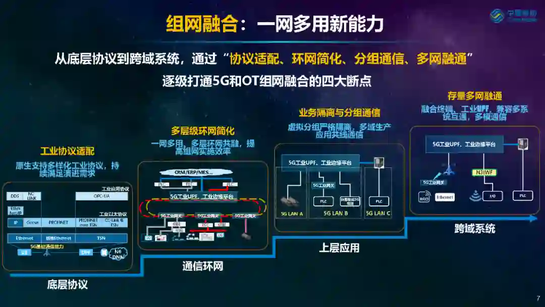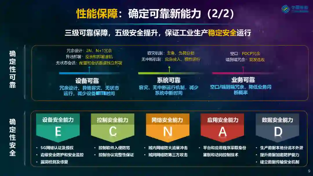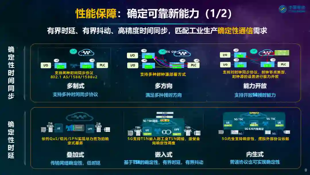首先,在组网融合方面,推动5G实现一网多用新能力。从底层协议到跨域系统,通过“协议适配、环网简化、分组通信、多网融通”逐级打通5G和OT组网融合的四大断点,利用5G实现组网整合。 其次,在性能保障方面,不断锻造5G确定性可靠能力。一方面,为匹配工业生产对有界时延、有界抖动确定性通信能力的极致追求,5G确定性工业生产网通过提供多制式的时间同步协议兼容、多方向授时以及5G能力开放等技术,实现叠加式、嵌入式以及内生式的多种确定性时延保障服务;另一方面,通过三级可靠保障(设备可靠、系统可靠和业务可靠)和五级安全提升(设备安全能力、控制安全能力、网络安全能力、应用安全能力和数据安全能力),保证工业生产稳定安全运行,构筑确定可靠和确定安全的服务保障。