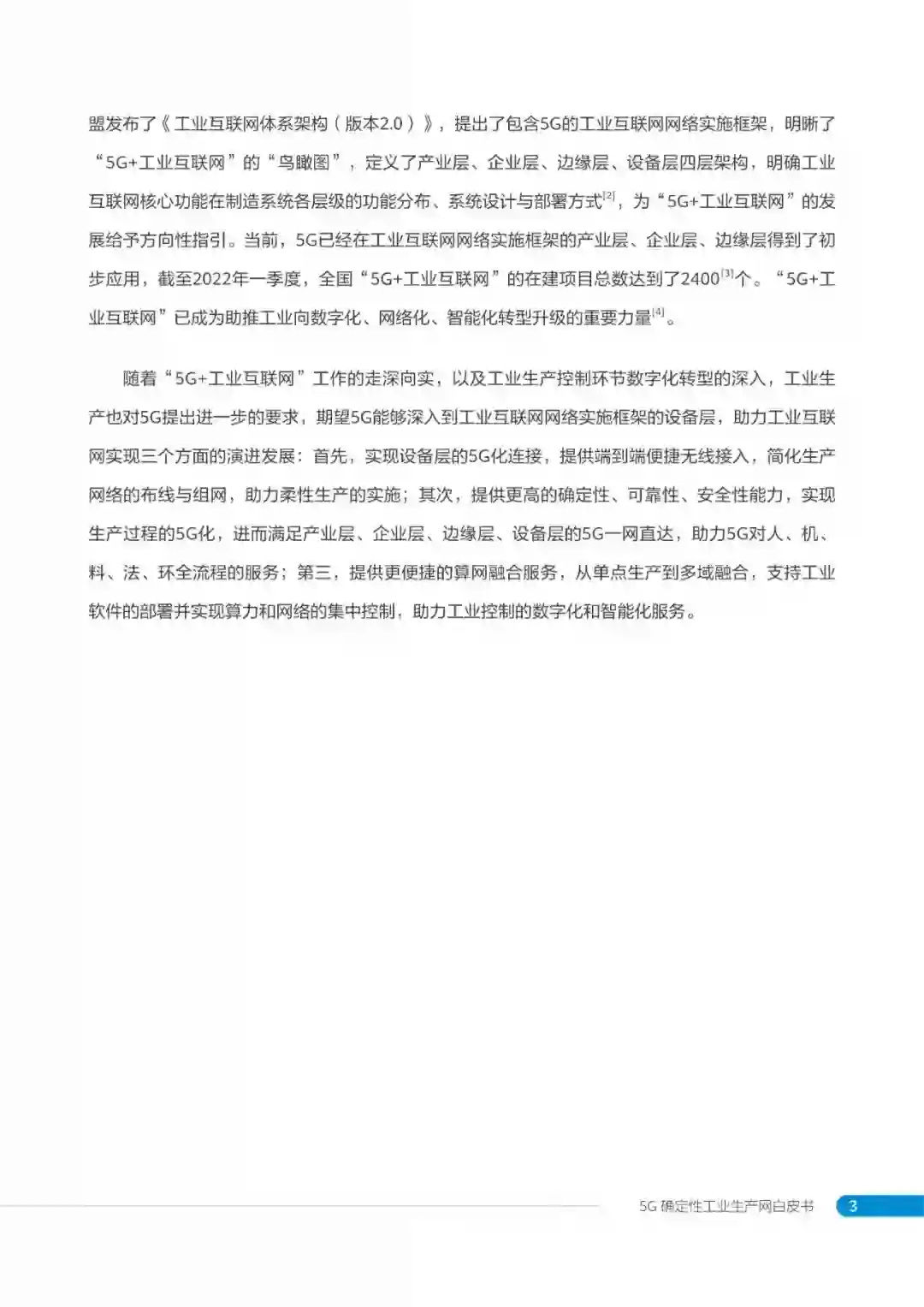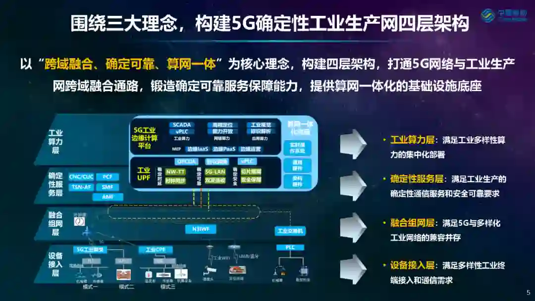 段晓东指出,为推进5G融入工业生产,网络架构是基础。白皮书以“跨域融合、确定可靠、算网一体”为核心理念,构建了5G确定性工业生产网四层架构,旨在打通5G网络与工业生产网跨域融合通路,锻造确定可靠服务保障能力,提供算网一体化的基础设施底座。其中,设备接入层能够满足多样性工业终端接入和通信的需求;融合组网层能够满足5G与多样化工业网络的兼容并存的要求;确定性服务层能够满足工业生产网络的确定性通信服务和安全服务要求;工业算力层能够满足工业应用多样性算力的集中化部署要求。
