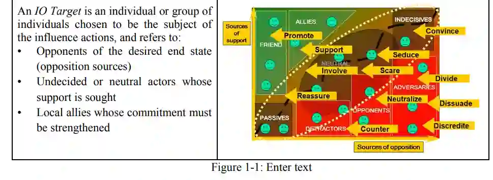 影响力作战涵盖所有为实现MIS目标而实施的军事行动,其行动特点包括:非强制化手段:侧重非武力、非权威压制的任务设计;多层级联动:主要服务于战略(MIS)与战役层级目标,但多在战术层面执行;精准文化适配:向"影响力作战目标"(IO目标)传递的信号/信息需在内容、形式、时机与传播途径上契合目标群体的文化-语言特征;环境深度分析:需开展针对影响受众环境的系统性分析以应对上述特殊约束。