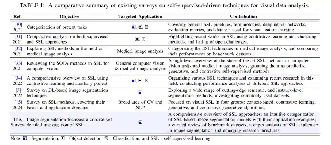 鉴于 SSL 在缓解数据稀缺问题方面的有效性,本文对近年来基于 SSL 的图像分割算法进行了深入的比较与分析,主要贡献包括: 1. 对自监督学习方法进行全面回顾; 1. 系统分类基于 SSL 的图像分割模型及其应用场景; 1. 梳理用于模型训练与评估的主流图像分割基准数据集; 1. 分析图像分割中 SSL 面临的挑战,并探讨未来的研究方向。