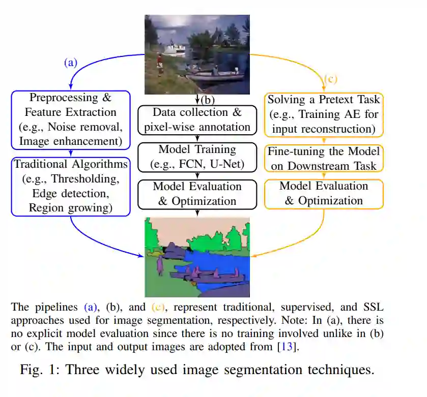 图像分割是诸多高阶视觉感知应用(如医学影像、智能交通、农业和监控等)的基础。尽管在基于 SSL 的语义分割领域中存在着巨大的研究潜力,系统梳理现有方法以追踪发展进展并为新入门研究者提供指导仍然十分必要。本综述全面调研了150余篇近期图像分割相关文献,重点聚焦于自监督学习方法,系统地对预设任务、下游任务以及图像分割研究中常用的基准数据集进行了实用性的分类和整理。最后,本文总结了从大量文献中提炼出的关键观察,并提出了未来的研究方向,旨在使该研究领域对读者更加易于理解与进入。 关键词—图像分割,机器学习,表示学习,自监督学习。