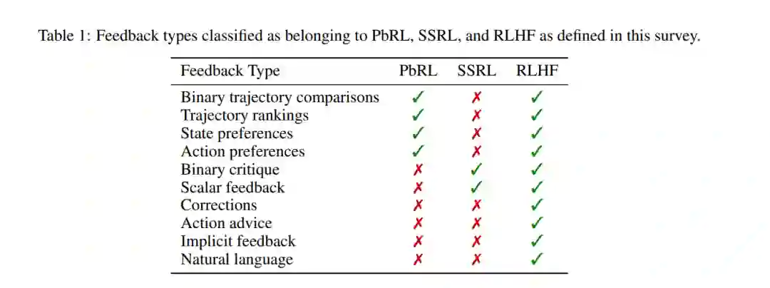 尽管存在重叠和有时存在冲突的使用,RLHF越来越被视为PbRL的一种泛化。尽管PbRL和RLHF都涉及使用人类反馈来定义RL目标,但PbRL主要关注相对反馈,如二元比较和排名。RLHF不仅包括这些方面,还扩展到更广泛的反馈类型(Metz等人,2023)。表1提供了我们对这些术语的解释性概述。