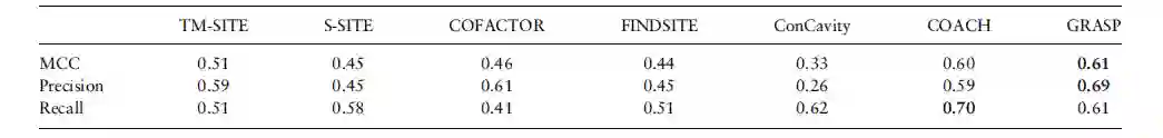COACH是一种基于序列和结构的方法的混合方法,同时也是目前最先进的以残基为中心的方法。作者使用来自COACH的基准数据集将GRaSP方法与COACH方法进行比较,数据集包含500个非冗余单链蛋白。GRaSP的MCC为0.61,仅需10到20秒即可完成预测,而COACH的MCC为0.60,需要2-5小时来预测类似大小的蛋白质。MCC是衡量二分类模型结果的评估指标之一,也是COACH作者用来与其他方法比较的主要指标,比单独使用的精确度和召回率更加均衡。表2总结了测试结果。表2 GRaSP方法和coach方法的比较结果************[****2]