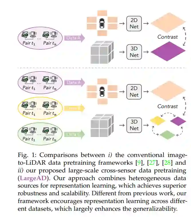 本文的其余部分组织如下。第2节回顾了自动驾驶数据感知与预训练以及多数据集利用的相关文献。第3节详细介绍了图像到LiDAR对比学习的基础知识。第4节阐述了所提出的大规模跨传感器预训练框架的技术方法。第5节展示了我们方法的实验验证结果。最后,第6节总结了本文并讨论了未来的研究方向。