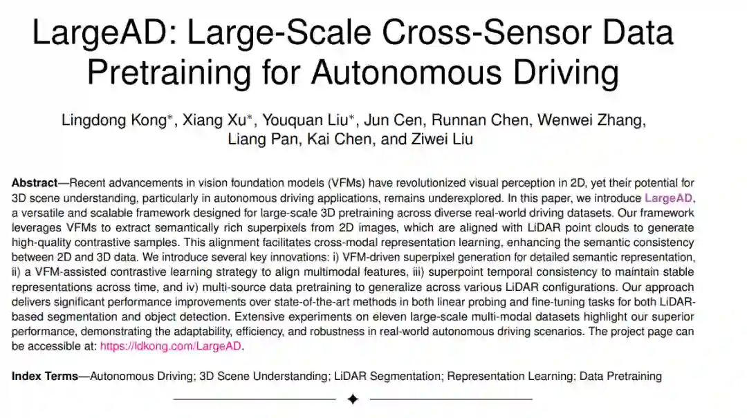 摘要—尽管视觉基础模型(VFMs)的最新进展在2D视觉感知领域取得了革命性突破,但其在3D场景理解(尤其是自动驾驶应用)中的潜力仍未得到充分探索。本文提出了 LargeAD,这是一个多功能且可扩展的框架,专为跨多种真实世界驾驶数据集的大规模3D预训练而设计。我们的框架利用VFMs从2D图像中提取语义丰富的超像素,并将其与LiDAR点云对齐以生成高质量的对比样本。这种对齐促进了跨模态表示学习,增强了2D与3D数据之间的语义一致性。我们提出了几项关键创新:i) 基于VFM的超像素生成,用于详细的语义表示;ii) 一种VFM辅助的对比学习策略,用于对齐多模态特征;iii) 超点时间一致性,以保持跨时间的稳定表示;iv) 多源数据预训练,以泛化到不同的LiDAR配置。我们的方法在LiDAR分割和目标检测的线性探测和微调任务中,均显著优于现有最先进方法。在十一个大规模多模态数据集上的广泛实验证明了我们方法的优越性能,展示了其在真实世界自动驾驶场景中的适应性、高效性和鲁棒性。项目页面可访问:https://ldkong.com/LargeAD。关键词—自动驾驶;3D场景理解;LiDAR分割;表示学习;数据预训练