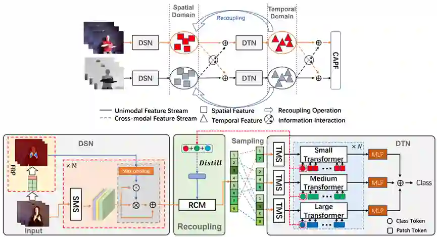 在行为识别领域,虽然当前的一些基于RGB-D模态的动作识别方法可以取得显著效果,但是他们都是建立在时空紧密耦合架构的基础上进行的时空信息建模。因此,这些方法主要存在以下三个问题:(1)由于时空建模过程的紧密耦合,导致在一些小数据集上面临一定的优化困难;(2)网络中包含的大量与分类无关的边缘冗余信息可能会误导分类器做出错误的决策;(3)视频多模态信息之间缺乏有效的时空交互导致后验融合机制不能充分发挥其作用。所以在本文中,我们提出了一种有效建模时空信息的解耦与重耦合机制以及一种新颖的RGB-D多模态时空信息交互策略。具体来讲,我们将多模态时空信息建模过程分成三个子任务:(1)通过解耦时空建模网络实现高质量维度无关的时间和空间表征学习。(2)重新耦合这些解耦的时空表征以重新建立强时空依赖。(3)引入一种新的跨模态时空信息交互方案和自适应后验融合机制(CAPF)来深度融合RGB-D多模态时空信息。通过充分利用以上技术,可以实现更加鲁棒的时空表征学习。