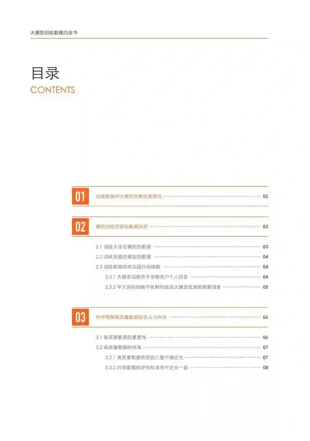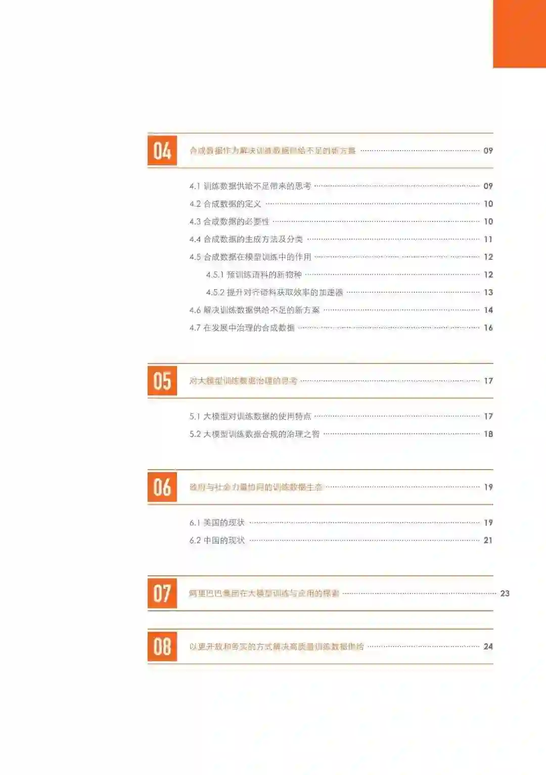 本白皮书首先分析了大模型训练所需的数据类型,并从产业实践出发破解了对训练数据的常见迷思和误解。在上述基础上,本书进而对训练数据的质量和规模进行讨论,发现高质量数据应在实践中检验效果,而难以用前置的客观标准衡量。同时,本书探讨了合成数据作为解决高质量训练数据供给不足的新方案,及其在大模型训练中的潜力。在训练数据合规方面,针对模型训练的特点,本书提出顺应模型发展的数据治理思路。最后,本书论述构建政府和社会力量协同的数据生态对满足大模型训练数据需求的重要性,并以阿里巴巴的实践为案例做说明和阐述。