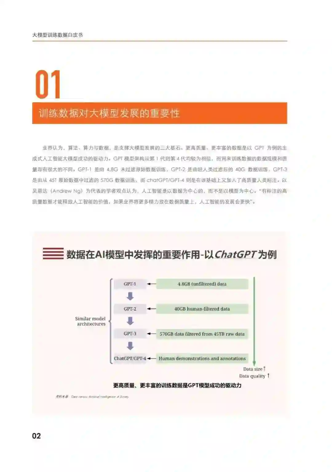 01 训练数据对大模型发展的重要性 算法、算力与数据,是支撑大模型发展的三大基石。更高质量、更丰富的数据是以GPT为例的生成式人工智能大模型成功的驱动力。