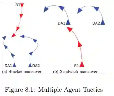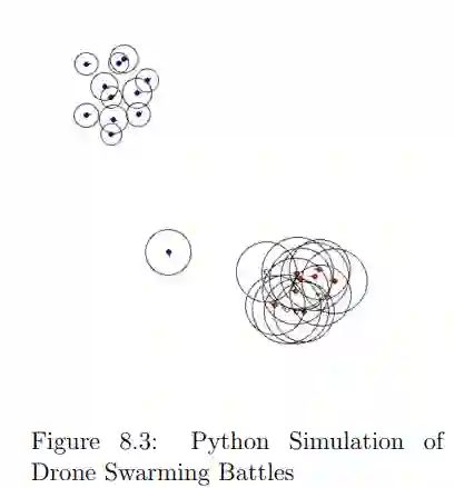 斯特里克兰等人利用模拟来测试各种无人驾驶飞行器的战术,并测试赢得战斗的决定性因素可能是什么。他们对一个具有战术的蜂群进行编程,并让这个蜂群与敌人的蜂群作战。智能体试图使用图8.1所示方法协调对敌方无人机的攻击。只有当有两架无人机对抗一架敌方无人机时,这些战术比单枪匹马射击敌人更有效,而且它们与其他成对的无人机之间有足够的空间。其次,一些特工会飞离敌人,作为保护自己的手段,从不对敌人使用任何攻击性战术。[Strickland 2019]