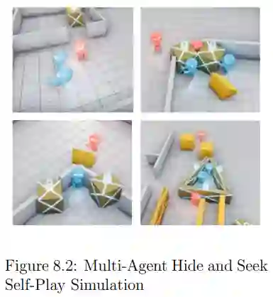 这个项目使用PPO在一个捉迷藏的游戏中使用强化学习来训练多个智能体。两个红色智能体是一个团队,被指定为寻找者,两个蓝色智能体是一个团队,被指定为隐藏者。如图8.2所示,这些智能体在一个有几面墙和一些积木的开放环境中游戏。智能体可以跑来跑去,对可移动的积木施加压力。红队在看到蓝队时得到奖励,蓝队在未被隐藏时得到奖励。两个智能体都是用自我发挥和策略优化算法进行训练的。两队进行了数百万次的训练迭代竞争,并制定了战术和技术来对付对方的行动。起初,两个团队都是漫无目的地跑来跑去,但他们最终发展出一些智能行为来帮助他们获得奖励。蓝队学会了如何堵住门,为自己创造庇护所,并从红队那里藏起其他物体。红队追赶蓝队特工,利用斜坡潜入他们的庇护所,跳到积木上面看墙。这些特工制定的一些战术甚至比人类程序员指示他们做的更有创意。最重要的是,这些智能体教会了自己如何合作,并为每个智能体分配一个特定的角色,以完成团队目标。这项研究的结果显示了强化学习和自我发挥的学习方法的力量。两个智能体都能发展出智能行为,因为它们之间存在竞争。我们将使用这个项目的框架来解决我们的无人机蜂群战术问题。将捉迷藏游戏扩展到无人机群战,将提高强化学习的能力。自我游戏技术在本项目未来工作的RL蜂群对战部分有特色,该部分详见第13.3节。[Baker 2018]