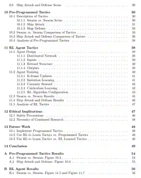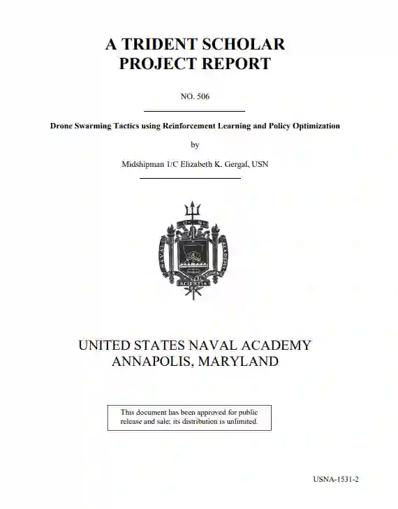 本报告首先介绍了促使需要无人机蜂群战术的当前事件,以及试图解决的问题的定义。接下来的章节提供了关于无人机、军事蜂群、强化学习以及本研究项目中使用的策略优化算法背景。还包括以前与RL有关的工作,以及它是如何与当前的无人机和蜂群技术结合使用的。下一节介绍了建立的环境/模拟。之后介绍了目前的成果。建立了两个不同的场景,并对每个场景进行了类似的测试。第一个是蜂群对战场景,第二个是船舶攻防场景。这两个场景描述了实施的程序化战术,并介绍了这些战术的比较结果。接下来,描述了RL智能体的设计和RL训练,并测试其有效性。在介绍完所有的结果后,分析了研究发现,并描述了这个研究项目的伦理和未来方向。