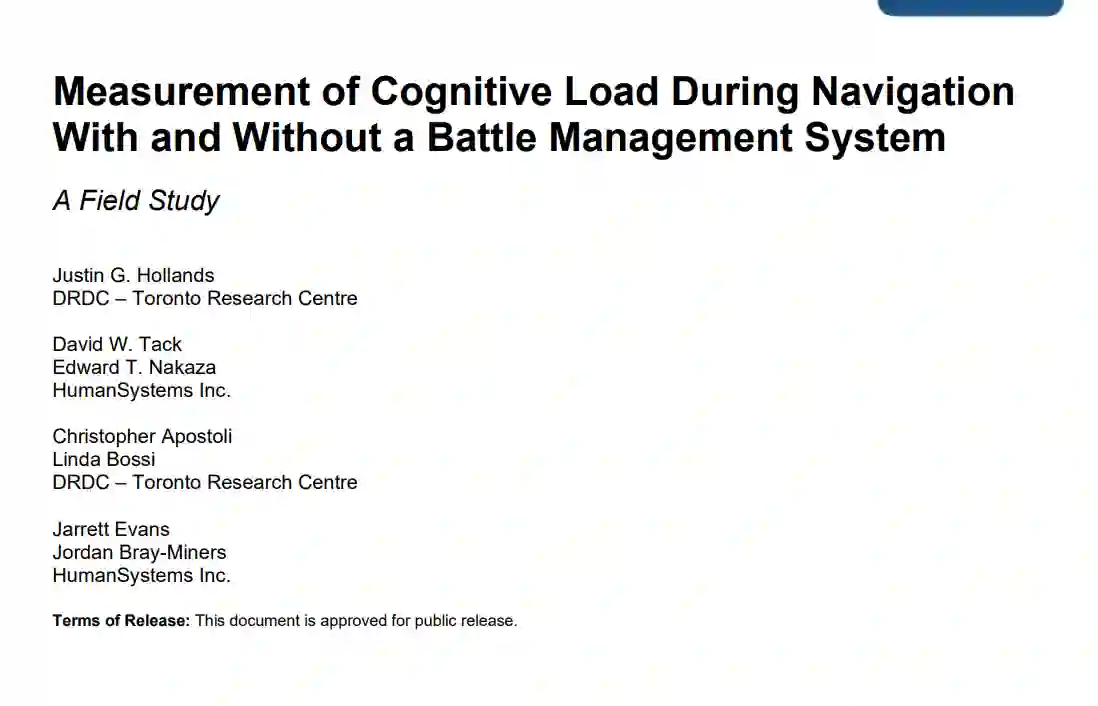 加拿大陆军最近投入使用了一种用于步行士兵的便携式战斗管理系统,名为 "综合士兵系统-套件"(ISS-S)。该系统为士兵提供战术信息,包括显示士兵当前位置的数字地图。在这项研究中,我们考察了在基线条件下使用 ISS-S 与传统导航方法(地图和指南针)相比在密林地形中的导航性能。此外,我们还使用了多种方法来评估心理工作量,包括主观、生理和基于表现的测量方法。本研究首次使用检测反应任务(DRT)来测量加拿大士兵在野外环境中的认知负荷。