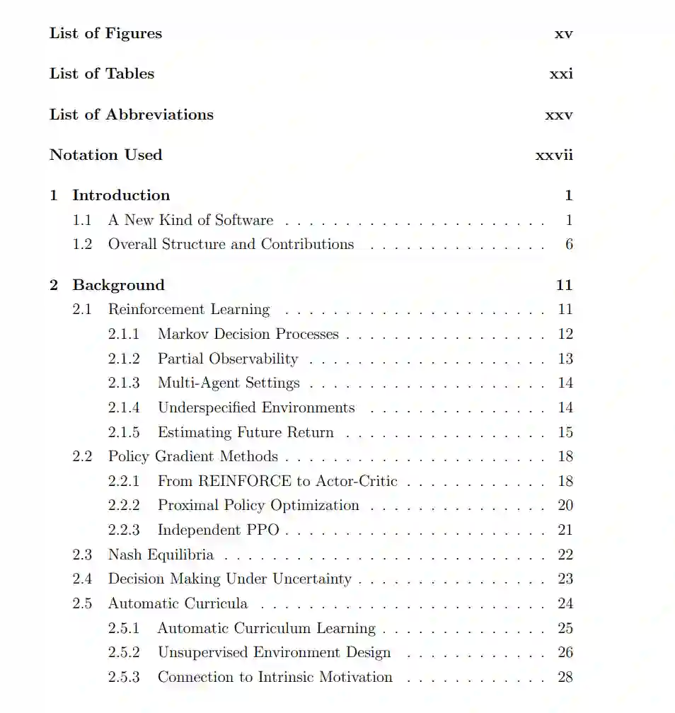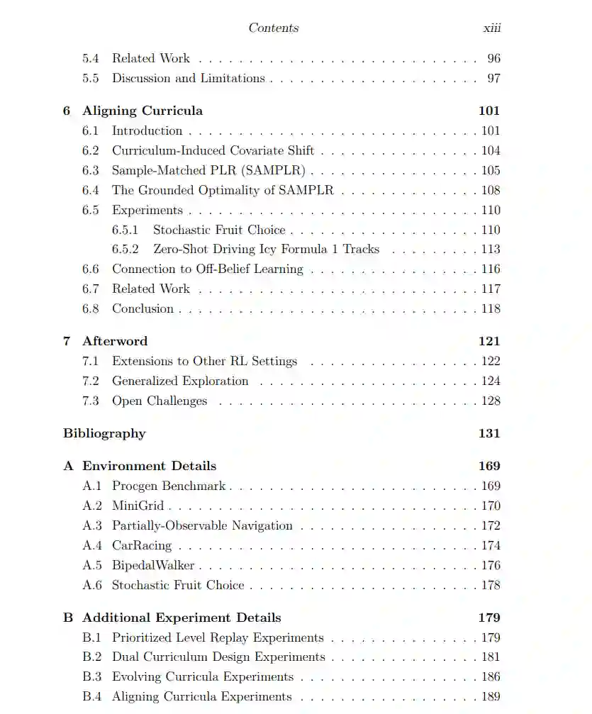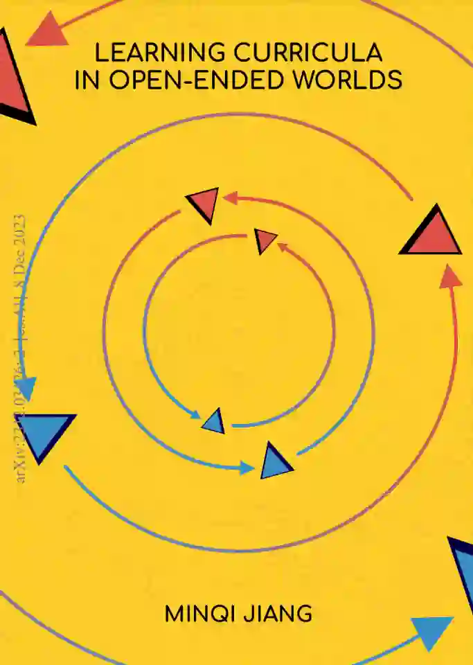 深度强化学习(RL)为训练最优序列决策智能体提供了强大的方法。由于收集现实世界的交互可能带来额外的成本和安全风险,通常的模拟到现实(sim2real)范式是在模拟器中进行训练,随后在现实世界中部署。然而,RL智能体容易过拟合于选定的模拟训练环境,并且更糟的是,一旦智能体掌握了特定的模拟环境集合,学习就会结束。与此相反,现实世界是高度开放的——特征是不断演变的环境和挑战,使得这种RL方法不适用。仅在大量模拟环境空间中进行随机化是不够的,因为这需要做出任意的分布假设,随着设计空间的增长,抽样对于学习有用的特定环境实例的可能性组合上会变得越来越小。理想的学习过程应该自动调整训练环境,以最大化智能体在开放式任务空间中的学习潜力,该任务空间与现实世界的复杂性相匹配或超越。本论文开发了一类称为无监督环境设计(UED)的方法,旨在通过原则性的方法逐渐提高学习智能体的鲁棒性和通用性,从而启用这样一个开放式过程。在给定的潜在开放式环境设计空间中,UED自动生成一个无限序列或课程表的训练环境,这些环境位于学习智能体能力的前沿。通过广泛的实证研究和基于最小最大后悔决策理论和博弈论的理论论证,本论文的发现显示,UED自动课程可以产生显著提升鲁棒性和泛化能力的RL智能体,使其能够应对以前未见的环境实例。这样的自动课程是朝向开放式学习系统的有前途的路径,这种系统接近通用智能——这是人工智能研究长期追求的目标——通过不断生成并掌握自己设计的更多挑战。
