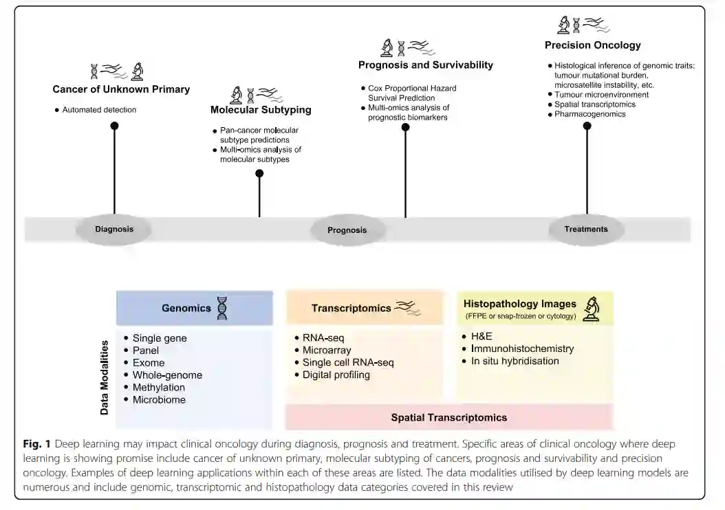 由于包括基因组、转录组和组织病理学数据在内的多种数据类型的可用性和整合性不断增加,癌症护理正在向精准医疗转变(图1)。用于转化研究或临床任务的多种高维数据类型的使用和解释需要大量的时间和专业知识。此外,多个数据类型的集成比单个数据类型的解释更占用资源,并且需要能够从大量复杂特征中学习的建模算法。使用ML算法来自动化这些任务并帮助癌症检测(识别癌症的存在)和诊断(表征癌症)已经变得越来越普遍[2,3]。令人兴奋的是,DL模型有潜力利用这种复杂性来提供有意义的见解,并从多种数据类型中识别相关的粒度特征[4,5]。本文综述了深度学习在癌症诊断、预后和治疗选择方面的最新应用。我们专注于组学和组织病理学数据的DL应用,以及多种数据类型的集成。我们提供了一个简短的介绍新兴DL方法相关的应用程序涵盖在这一综述。接下来,我们将讨论DL在肿瘤学中的具体应用,包括肿瘤起源检测、分子亚型鉴定、预后和生存能力预测、基因组性状的组织学推断、肿瘤微环境分析以及未来在空间转录组学、宏基因组学和药物基因组学中的应用。我们总结了目前的挑战和潜在的策略,使DL在临床环境中常规应用。
