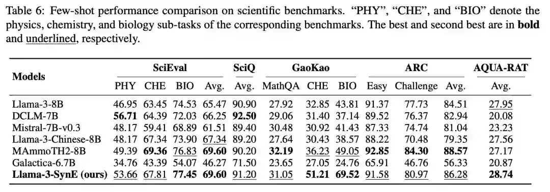 大语言模型(large language model,LLM)相关研究在推动人工智能发展方面取得了重大进展,但在特定场景中仍然存在知识缺口问题。例如,主要在英文语料上预训练的 Llama-3 在中文任务上的表现较差,作为通用模型,它在多学科科学知识上的表现也不足。为了解决这些问题,继续预训练(continual pre-training,CPT)是一种广泛使用的方法,通过在特定领域数据上进行 CPT,增强模型在新领域的能力。然而,CPT 过程中的一个技术难题是“灾难性遗忘”,即新能力得到增强但原有能力大幅下降。尽管现有工作广泛开展了 CPT,但在如何通过有限的训练预算提高模型的综合能力方面,关键的训练细节(如数据选择、混合和课程设计)尚未得到充分讨论。 为了使 CPT 更具可追溯性,本研究展示了一份技术报告,通过 CPT 显著增强了 Llama-3(8B)的中文语言能力和科学推理能力。为了在增强新能力的同时保持原有能力,我们利用现有数据集并合成高质量数据集,设计了特定的数据混合和数据课程策略。我们将 CPT 后的模型命名为 Llama-3-SynE(Synthetic data Enhanced Llama-3)。此外,我们还进行了相对较小模型——TinyLlama 的调优实验,并将得出的结论用于对 Llama-3 的 CPT。我们在十几余项评估基准上多维度测试了Llama-3-SynE的性能,结果表明我们的方法在不损害原有能力的情况下,大大提高了Llama-3的性能,包括通用能力(C-Eval 提升了 8.81,CMMLU 提升了 6.31)和科学推理能力(MATH 提升了 12.00,SciEval 提升了 4.13)。我们的研究贡献如下: