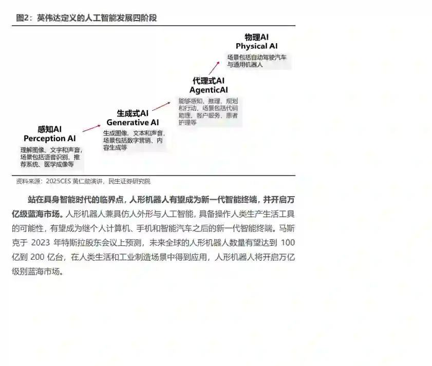 具身智能有望开启万亿级蓝海市场。在当前时点复盘机器人与人工智能的发展历程,机器人已经进入具身智能时代,与此同时,人工智能也将走向“物理AI”发展阶段。人形机器人是两者汇聚的交点,也是具身智能时代的临界点,有望成为新一代智能终端,并开启万亿级蓝海市场。