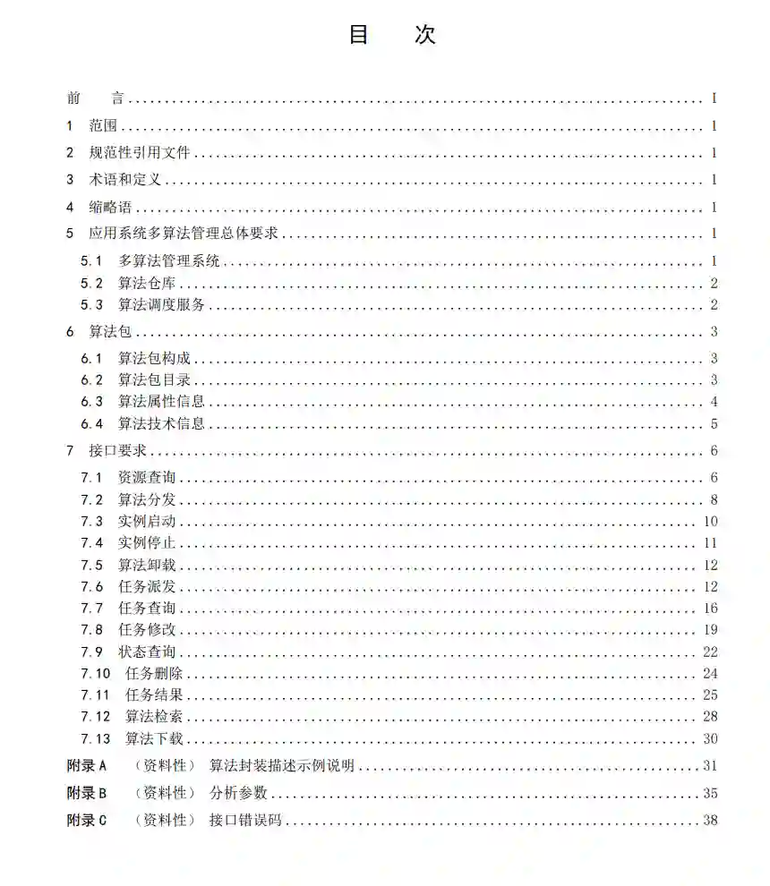近年来随着人工智能理论和技术的快速发展,产生了越来越多的基于各种场景化的智能算法,对图片、视频、音频等数据进行内容分析与描述,帮助人们解决业务问题,提高生产效率。算法成为了智慧城市、智慧交通、智慧医疗、智慧小区等领域中关键组成部分,越来越多的厂商加入到算法开发的潮流中。然而在算法快速发展、提供便捷的同时,缺乏算法相关的技术标准规范,导致算法在管理和使用上的一系列问题。包括: (1)不同算法厂商之间的算法集成困难:各个算法厂商之间开发规范、封装描述标准不统一,导致算法在标准集成、统一管理、统一调度、三方接入等方面存在一定困难,导致每个项目,不同厂商之间需要单独对接、定制开发。(2)算法碎片化加大了管理复杂度:AI 本身的赋能属性,会紧紧和场景结合在一起,而场景则意味着个性化,因此场景就呈现出碎片化,从而导致算法碎片化。由于碎片化太过严重,算法持续不断的增加,增加了算法管理的难度。(3)算法需求方与算法厂商存在壁垒:单一厂商无法做到一家涵盖所有算法,需要借助各个算法厂商一起完成。市面上很多客户有迫切的算法需求,但因算法集成接入缺乏行业相关标准,导致一些小的算法厂家参与各类项目困难。为解决上述问题,工作组拟制订多算法应用系统算法管理技术标准,加快算法的应用落地。算法应用系统通过统一管理不同厂商、不同平台、不同版本的算法,对算法标记多维度的标签,对进行算法分类管理,便于算法使用者检索所需算法。算法应用系统对算法进行运营管理,以便算法管理者了解系统中各算法使用情况。算法应用系统接收应用系统的分析任务,根据分析任务的要求和系统中边缘计算服务或终端计算单元的运行情况,选择合适的算法并将对应的算法包分发到匹配的边缘节点或终端节点,同时将边缘计算服务或终端计算单元反馈的分析结果推送到目标系统或者由边缘节点或终端节点直接将分析结果推送到指定的目标中。通过获取边缘计算服务或终端计算单元中的分析任务执行状态对分析任务进行监控,人工或根据预设策略处理异常任务,提高系统可用性。