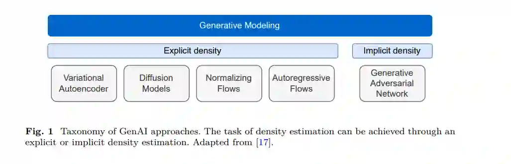 生成式人工智能(GenAI)领域代表了旨在学习给定数据集 x∈Xx \in Xx∈X 的概率分布 p(x)p(x)p(x) 的半监督和无监督深度学习技术。在深度学习的背景下,GenAI方法使用参数化的人工神经网络(ANNs)来近似概率分布 p(x)p(x)p(x),这些网络通过权重 Θ\ThetaΘ 进行参数化,从而得到一个参数化模型 pΘ(x)p_\Theta(x)pΘ(x)。与判别式深度学习技术相比,判别式技术近似的是在给定输入 xxx 的情况下,属性(或标签) yyy 上的概率分布 p(y∣x)p(y|x)p(y∣x),而生成模型 GGG 可以用于从训练数据分布中抽取类似样本 x~∼pΘ(x~)\tilde{x} \sim p_\Theta(\tilde{x})x~∼pΘ(x~) [16]。 对 p(x)p(x)p(x) 的估计可以分为显式和隐式两种方法。显式估计模型尝试提供概率密度 pΘ(x)p_\Theta(x)pΘ(x) 的参数化,而隐式估计模型则构建一个合成数据的随机过程[17]。生成式人工智能的分类概述(参见图1)总结了现有估计 pΘ(x)p_\Theta(x)pΘ(x) 的方法。不论模型类型如何,它们生成逼真高分辨率图像的能力使得它们在解决诸如图像修复、图像去噪、图像到图像翻译以及其他图像编辑问题等经典计算机视觉任务中得到了广泛应用。它们在学术基准测试中的出色表现,使其在机器视觉领域中具有重要意义。每种模型架构的进一步描述及其优缺点将在以下小节中进行探讨。 3 研究方法