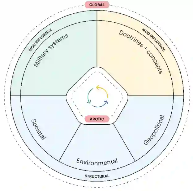 图 1.1 作战环境建模。在考虑这些因素对北极的影响之前,先评估了这些因素的全球趋势。五个因素中有三个是结构性因素,而国家对军事系统和条令有更多的控制权。