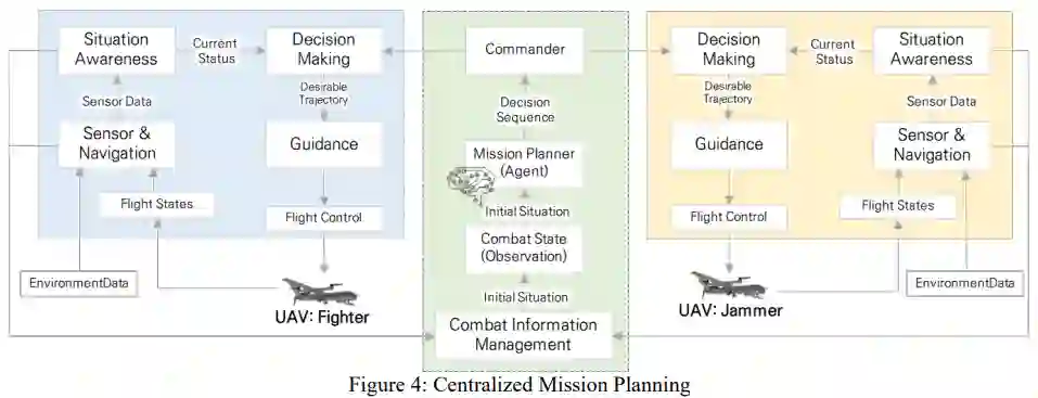 因此,集中任务规划架构实现了从各种信息源收集和处理数据、规划和调整无人机行动以适应实时战场条件的战略。这就实现了实时战略决策和快速反应,提高了整体作战效率和生存能力。