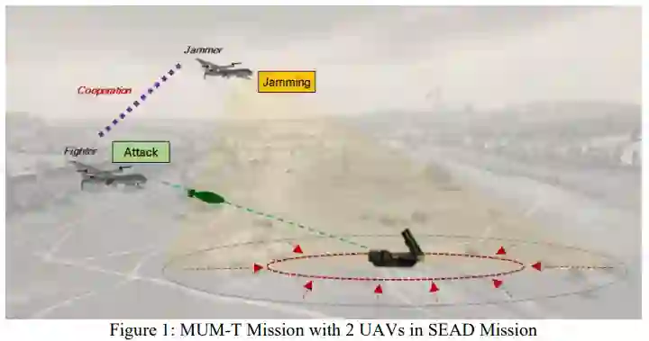 我们为 MUM-T 问题开发了一个量身定制的强化学习环境。在这个环境中,我们部署了一架战斗机无人机、一个干扰器和一个防空导弹系统,每个系统都有预定义的攻击范围和干扰距离。任务的主要目标是协同参与干扰行动,使目标防空导弹系统失效,随后通过操纵战斗机无人机将其消灭。任务的成功完成取决于是否到达指定的目标点。