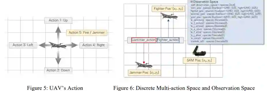 在每个时间步长内,智能体根据其选择的行动在网格环境中移动。我们施加了边界条件(惩罚),以防止无人机在网格边界外移动。此外,我们还通过检测碰撞并分配相应的惩罚来处理战斗机和干扰机之间的潜在碰撞。为了解决无人飞行器之间的协作问题,我们为智能体之间的特定功能和互动建立了模型。当干扰机进行干扰时,如果萨母不在攻击范围内,则会产生惩罚。但是,如果防空导弹在攻击范围内,干扰成功则会获得奖励,使防空导弹无法使用。战斗机总共有五次攻击机会,攻击失败(当防空导弹不在攻击范围内时)会导致失去一次攻击机会并受到惩罚。另一方面,如果防空导弹在规定的攻击范围内,防空导弹就会失效,并获得奖励。重要的是,如果战斗机没有进行干扰,则无法攻击,因为战斗机的攻击范围小于干扰距离。
