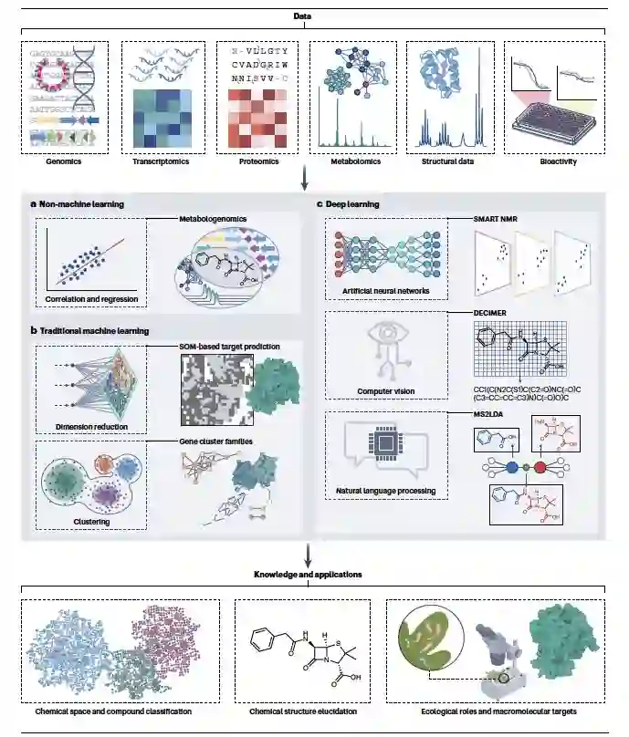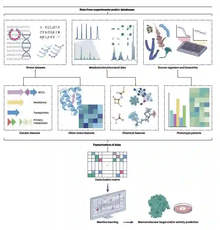 细菌、真菌、植物和动物都能产生各种各样的专有代谢物,也被称为天然产物。这些天然产物包括了成千上万的不同化学结构,如肽和生物碱等等。这些物质帮助生物在特定的环境中茁壮成长,它们在复杂的生物间互动中起到关键作用,如作为信号、武器、营养侦查剂等等,以调解竞争和合作。在宿主-微生物群落的背景下,这些专有代谢物介导了微生物与其宿主之间的竞争和合作。历史上,这些天然产物在抗生素、化疗药物、免疫抑制剂和农作物保护剂的应用上取得了令人瞩目的成功。由于它们具有相对较高的三维性(与常见的“平坦”合成结构相反),这可能对调节具有挑战性的药物靶标很重要,以及它们作为天然代谢物的起源,这使得它们可能成为可以帮助药物到达其靶标的转运系统的底物。尽管在大约1990年到2010年之间,由于组合化学和高通量筛选的兴起,天然产物发现在制药行业的受欢迎程度有所下降,但在学术界和小型生物技术初创公司中,天然产物研究近年来已经复兴。这次复兴是由大规模的组学数据的可用性所驱动的,这些数据允许我们更深入地探索生物圈中隐藏的化学宝藏。在细菌和真菌中,大多数专有代谢物生物合成途径的基因(以及一些在植物和动物中的基因)在产生它们的生物的基因组中以簇的形式出现:现在已经实验性地表征了超过2500个这样的生物合成基因簇(BGCs)及其产物。这种物理上的聚集有可能促进通过计算基因组分析识别数百万可能的新分子的生物合成途径,这些途径可能为药物发现提供了起点。基于组学的自然产物发现和计算药物设计领域之间存在巨大的互补潜力(图1)。人工智能的使用可能会迅速推动这些领域的科学进步,并使它们的方法和方向趋于一致。例如,科学家们已经开始应用机器学习——一种通过使用算法从数据中识别模式以产生洞察力的人工智能子领域——来发现和结构表征自然产物,并预测结构与药物属性之间的关系。