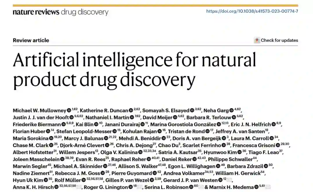 参考资料 Mullowney, M.W., Duncan, K.R., Elsayed, S.S. et al. Artificial intelligence for natural product drug discovery. Nat Rev Drug Discov (2023). https://doi.org/10.1038/s41573-023-00774-7