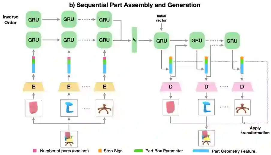 三维形状物体的生成是计算机图形学和计算机视觉领域的一个重要问题。图形学关注三维物体的建模,而计算机视觉关注如何推断,如从单张图片的输入,对应三维物体的形状。近年来,很多工作开始使用深度神经网络结合不同的三维表达方式来实现三维形状的生成,如体素(voxel),点云(point clouds),三角网格(mesh)以及隐式曲面表达(implicit function)。大部分此类工作生成的是非结构化的三维物体,但是结构化的表达对于感知和理解三维物体是很重要的,如物体不同组件的构成、关系等。
