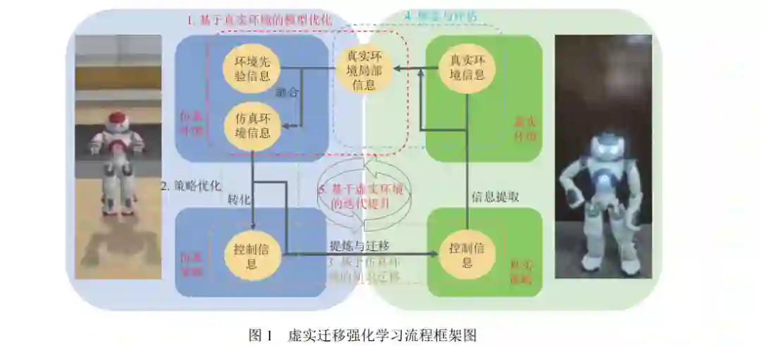 虚实迁移[24,30,100]指机器人在仿真环境中进行训练, 获得的策略被迁移部署至真实机器人控制系统中, 其中仿 真环境作为源域, 真实环境作为目标域, 机器人的控制策略作为迁移对象, 核心内容是实现环境信息与控制信息在 真实环境与仿真环境之间的迁移. 虚实迁移对迁移效果提出了 4 个重要的目标: 有效性、效率性、安全性、泛化 性. 有效性[101,102]是指在仿真环境中学到的策略能在真实世界中发挥预期作用, 即在仿真环境中获得高回报的策略 在真实环境中也能获得较高回报, 针对有效性的研究大多从缩小环境差异角度着手. 效率性[103,104]从采样的时间与 经济成本出发, 强调在真实世界中进行尽可能少的探索采样, 针对效率性的研究关注对真实样本中环境信息的充 分挖掘与利用. 安全性[105,106]强调现实中的探索与直接的策略部署具有潜在的安全风险及较高的成本代价, 需要指 导真实机器人进行安全的探索与样本收集. 泛化性[107,108]针对多任务迁移场景, 强调获得的策略能在尽可能少的微 调下快速适应不同环境的任务. 本文主要关注围绕虚实迁移的有效性以及效率性开展的相关研究工作, 在此基础 上对现有方法进行梳理总结. 本文从迁移学习过程中的信息流动和智能化方法作用对象的角度提出了一个通用的虚实迁移强化学习系统 流程框架, 如图 1 所示. 首先将策略学习与迁移过程分为以下 5 个主要步骤: 基于真实环境的仿真模型优化、仿真 策略优化、基于仿真环境的知识迁移、真实环境探索与评估, 以及基于虚实环境的策略迭代提升. (1) 基于真实环境的仿真模型优化: 通过修正或调整仿真模型来缩小仿真环境与真实环境的差异. (2) 仿真环境策略优化: 通过仿真环境的交互样本对策略进行学习训练. (3) 基于仿真环境的知识迁移: 将仿真环境中获取的学习知识向真实环境迁移.(4) 真实环境探索与评估: 对真实环境进行充分探索以及部署策略性能评估. (5) 基于虚实环境的策略迭代提升