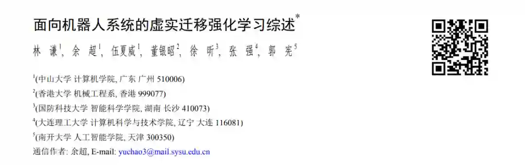 本文总结了有关于机器人虚实迁移学习的主要工作, 从迁移学习过程中数据信息流动和智能化方法作用对象 的角度提出一个虚实迁移的流程框架, 并在此基础上提出了当前虚实迁移学习技术的 3 个主要方向: 基于真实环 境的仿真模型优化、基于仿真环境的知识迁移、基于虚实环境的策略迭代提升. 接着, 对每个方向中的主要方法 以及相关工作进行阐述, 并对比了一些代表性工作的实验内容. 最后, 介绍虚实迁移学习领域未来面临的挑战, 给 出了相应的解决思路与发展方向. 值得说明的是, 除了机器人领域, 虚实迁移强化学习相关思想与技术也可广泛应 用于其他领域, 以避免高风险的真实环境交互并提高训练效率. 如在金融交易中, 虚实迁移强化学习可应用于虚拟 金融市场环境中的交易策略开发和优化, 以提高交易策略的性能和鲁棒性, 并将其应用于实际市场中进行交易. 另 外, 在医疗决策场景中, 虚实迁移强化学习可用于在虚拟环境中训练智能代理来模拟医疗治疗决策, 并将其迁移到 实际临床实践中, 以提高医疗决策的准确性和效果. 我们希望通过对当前相关工作的分类与总结, 为相关研究人员 提供一种新的视角解读虚实迁移强化学习领域的研究现状与方向.