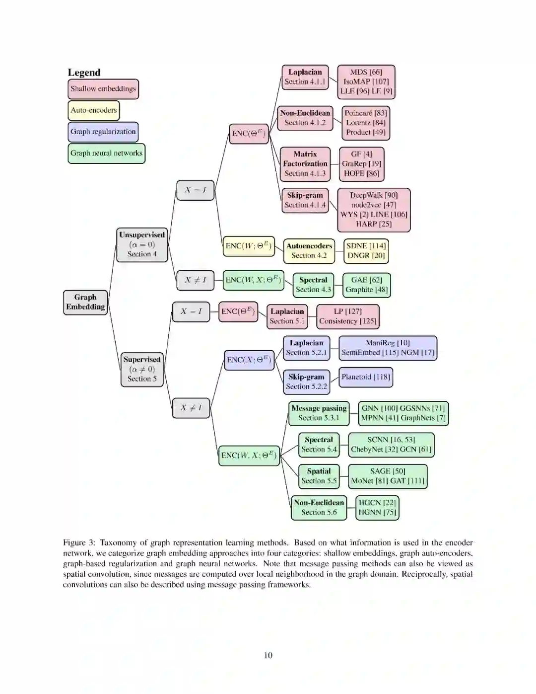 在这项工作中,我们扩展了Hamilton等人提出的编码-解码器框架,并介绍了一个通用的框架,图编码解码器模型(GRAPHEDM),它允许我们将现有的工作分为四大类: (i)浅嵌入方法,(ii)自动编码方法,(iii) 图正则化方法,和(iv) 图神经网络(GNNs)。此外,我们还介绍了一个图卷积框架(GCF),专门用于描述基于卷积的GNN,该框架在广泛的应用中实现了最先进的性能。这使我们能够分析和比较各种GNN,从在Graph Fourier域中操作的方法到将self-attention作为邻域聚合函数的方法[111]。我们希望这种近期工作的统一形式将帮助读者深入了解图的各种学习方法,从而推断出相似性、差异性,并指出潜在的扩展和限制。尽管如此,我们对前几次综述的贡献有三个方面