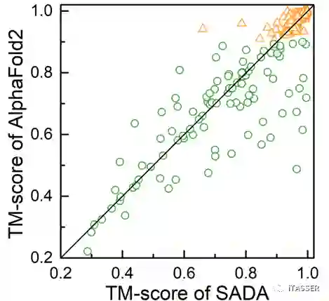 图4. AlphaFold2 预测的全链模型与SADA 重组之后的全链模型TM-score比较(三角形表示AlphaFold2预测的模型的TM-score大于等于0.9,圆圈表示AlphaFold2预测的模型的TM-score小于0.9)