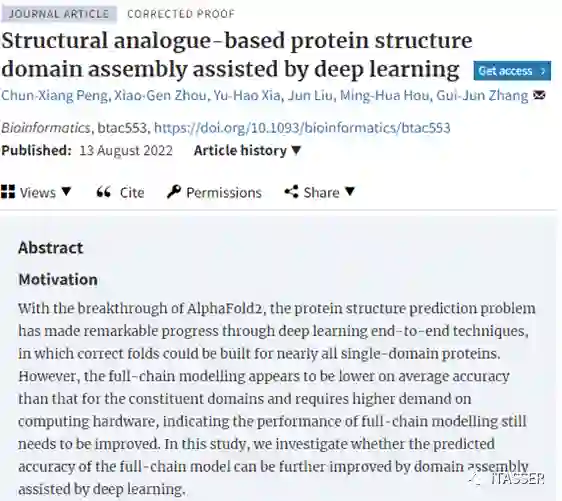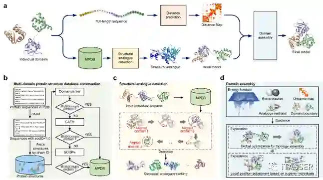 蛋白质结构域是位于二级结构和三级结构之间的一个层次,每个结构域一般由100~250 个氨基酸残基组成,单个结构域具有独特的空间构象。一条较长的蛋白质全长单链通常会包括若干个结构域,某些区域相邻的氨基酸残基首先形成有规则的二级结构,然后由若干二级结构折叠成近似于球状的结构域,最后通过两个或多个结构域组装形成多结构域蛋白(简称多域蛋白)的三级结构。结构生物学领域普遍认为结构域是蛋白质三级结构的独立折叠单元和独立功能单元。从生物学意义上来讲,多域蛋白质中结构域间缔结对于促进以协作方式实现多个相关的功能至关重要,域间铰链区(Linker)结构柔韧性使结构域之间容易发生相对运动,这将有助于结合底物或施加应力,有助于别构中心结合调节物和发生别构效应,从而促进于酶对反应的催化,致使这些部位往往是活性中心所在的部位,或是变构物结合的部位。因此,阐明多域蛋白的结构是理解其全部功能的关键步骤! 自然界生物中,大约有超过80%的真核蛋白和67%的原核蛋白均含有多个结构域。PDB库最新统计结果表明,现有实验测定结构蛋白质中只有大约35%的单链为多域蛋白,且绝大多数的多域蛋白单链仅包含2个或3个结构域,极少数超过5个结构域。考虑到PDB库中存储的蛋白结构源于实验测定,似乎可以得到一个明显的结论:由于X衍射、NMR及冷冻电镜等结构生物学实验测定手段的技术瓶颈,多域蛋白结构实验测定速度远低于单域蛋白。幸运的是,随着人工智能、生物大数据及计算技术的深入发展,2020年谷歌DeepMind团队推出的AlphaFold2,使得蛋白质单结构域预测问题取得了突破性的进展。AlphaFold2几乎可以正确预测所有单域蛋白质结构,模型精度几乎可以与生物湿实验测定结构相媲美。但是也发现,对多域蛋白质全链建模的平均精度似乎低于建模所组成域结构的平均精度,这也正好说明了多域蛋白质结构建模技术仍然是一个目前尚未解决的挑战性研究课题。如何利用局部结构相似性与全局结构相似性的内在关系,同时在降低训练、推断的硬件需求前提下,进一步提高多域蛋白质建模精度是一个值得关注的重要问题。 浙江工业大学张贵军教授课题组于2022年8月13日在生物信息学领域期刊《Bioinformatics》上发表了题为《Structural analogue-based protein structure domain assembly assisted by deep learning》的研究论文(图1),提出了深度学习辅助的结构类似物多域蛋白质域组装方法(简称SADA)。在356个测试蛋白上,SADA与主流的结构域组装方法进行了比较,SADA模型的TM-score分别比DEMO和AIDA模型高8.1%和27.0%。在AlphaFold Protein Structure Database(AFDB)中系统选取的293个人类多域蛋白质上,经SADA重新组装后的模型的平均TM-score比AlphaFold2的全链模型高出1.1%。SADA服务器参加了全球持续蛋白质结构预测竞赛CAMEO,在近三个月(2022-3-18至2022-06-11)的评测中,也获得了所有服务器(包括公开和匿名)中排名第一的成绩。进一步,在部分蛋白质复合物初步测试中,相比于AlphaFold-multimer和RoseTTAFold等算法,实验结果表明尽管SADA是面向多结构域单链建模设计,但是也表现出了组装不同链间域-域相互作用的可能和潜力。该论文通讯作者为浙江工业大学信息工程学院张贵军教授,浙江工业大学信息工程学院彭春祥博士生为第一作者、周晓根博士为共同第一作者。