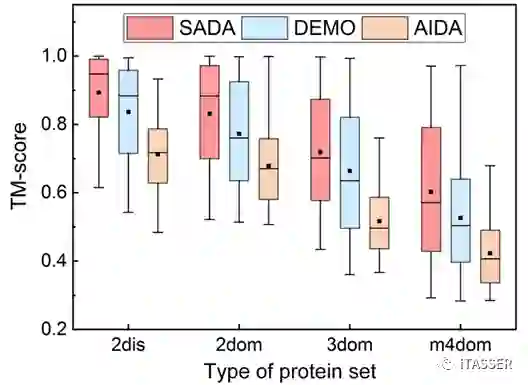 图3. 在不同多域蛋白类型上SADA、DEMO和AIDA组装模型的比较结果