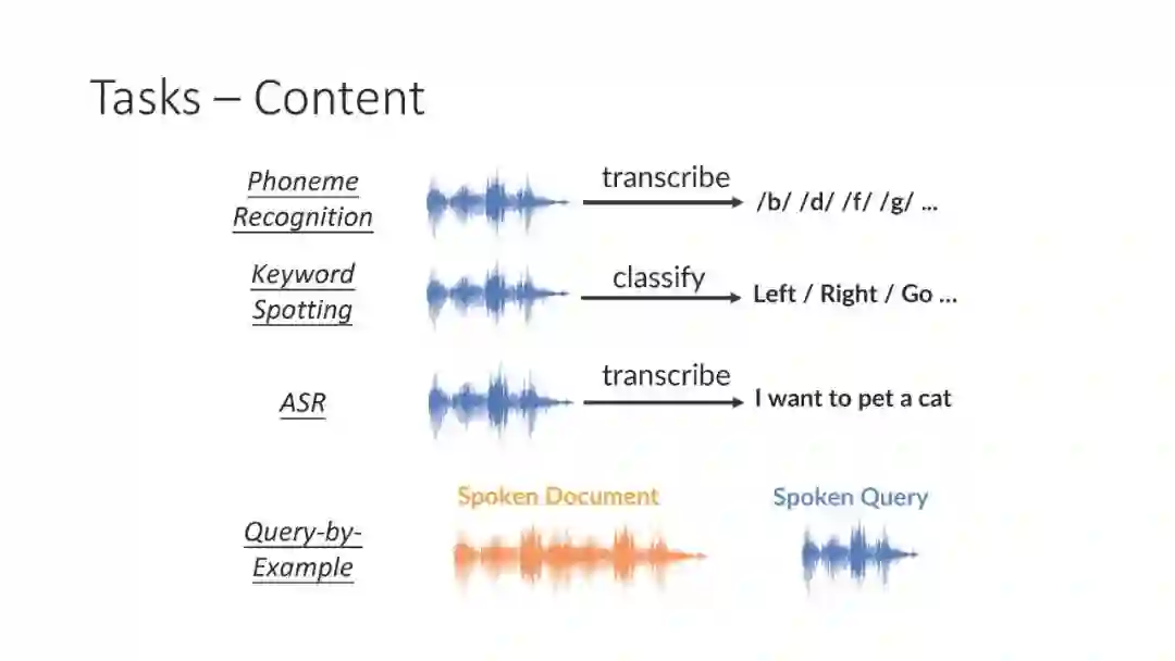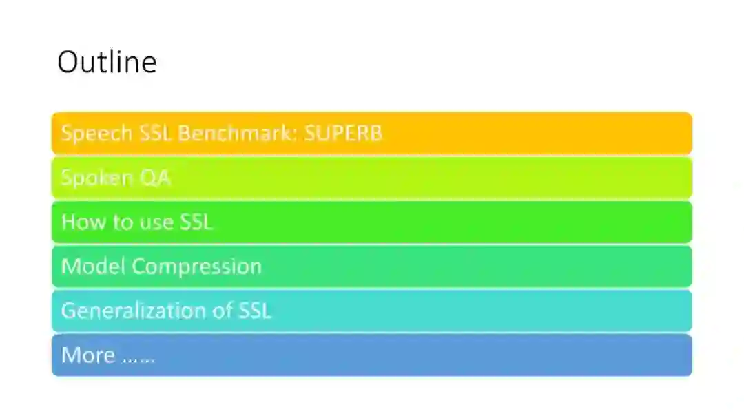 自监督表示学习方法有望提供一个单一的通用模型,使一系列任务和领域受益。他们最近在NLP和计算机视觉领域取得了成功,达到了新的性能水平,同时减少了许多下游场景所需的标签。语音表征学习也有类似的进展,主要有三种类型:生成式、对比式和预测式。其他方法依赖于多模态数据进行训练前的预处理,将文本或视觉数据流与语音混合。虽然自我监督语音表示仍是一个新兴的研究领域,但它与声学词嵌入和零词汇资源学习密切相关**。本教程将介绍自监督语音表征学习方法及其与相关研究领域的联系**。由于目前的许多方法只将自动语音识别作为下游任务,我们将回顾最近对已学习的表示进行基准测试的努力,以扩展这种表示在语音识别之外的应用。本教程的实践部分将提供构建和评估语音表示模型的实际指导。