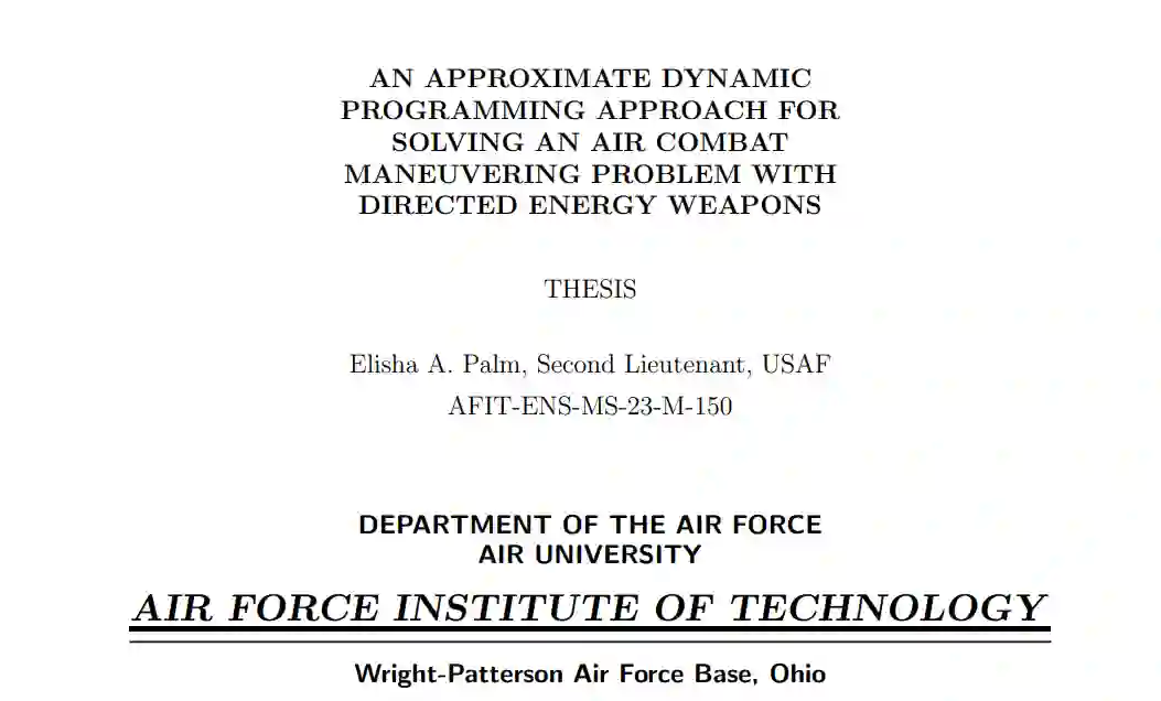 在视距(WVR)内进行空战需要执行复杂的空中机动和快速的顺序决策。如果加入额外的武器能力,这些决策的复杂性还会进一步增加。无人自主飞行器技术和武器能力的发展有助于克服人为限制带来的障碍。事实证明,自主无人作战飞行器(AUCAV)和定向能武器(DEWs)等先进武器能力在 WVR 空战中至关重要。这就引出了一个问题--AUCAV 能否拥有适当的人工智能和武器能力,以改进高质量的空战演习和战术?为了研究这个问题,本文提出并解决了广义空战机动问题(ACMP),在这个问题中,通过建模来控制一架防御型 AUCAV,该 AUCAV 正在寻求与攻击型敌机交战。该模型利用每架飞机的 5 自由度点质量来跟踪其状态转换,同时还跟踪内部携带的火炮和 DEW 能力。由于该问题的维度较高,提出了一种近似动态规划(ADP)方法,其中开发了一种近似策略迭代算法。这种 ADP 算法通过神经网络回归来实现高质量的战斗机战术和机动。计算实验结果表明,在 3 个问题实例中,有 2 个实例的 ADP 策略优于所有 3 个基准策略。ADP 策略学会了同时使用内部携带的火炮和 DEW,这促进了 ACMP 中任一武器平台的态势效益理念。在 WVR-ACMP 中加入 DEW 功能可以体现前所未有的空战战术。