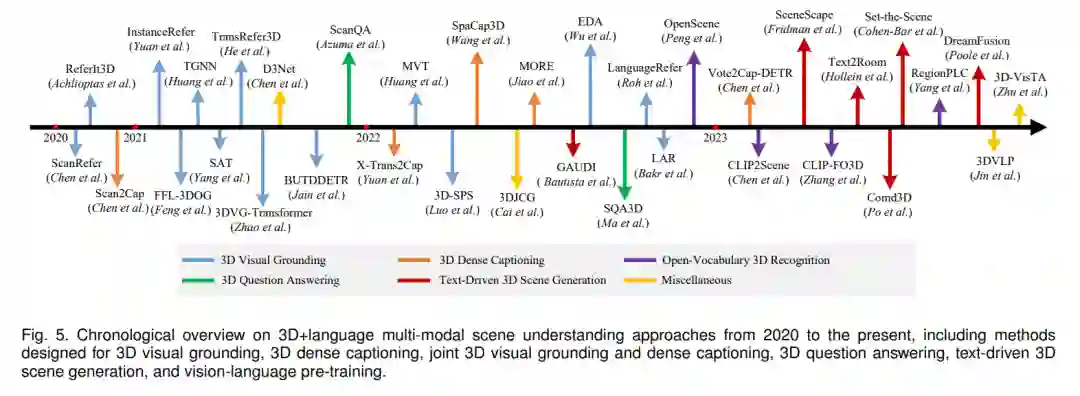 3D+语言多模态场景理解可以分为3D视觉锚定、3D密集标注、3D问题回答、文本驱动的3D场景生成、开放词汇的3D识别以及其他类别。从2020年至今的现有3D+语言多模态方法的时间性概述如图5所示。