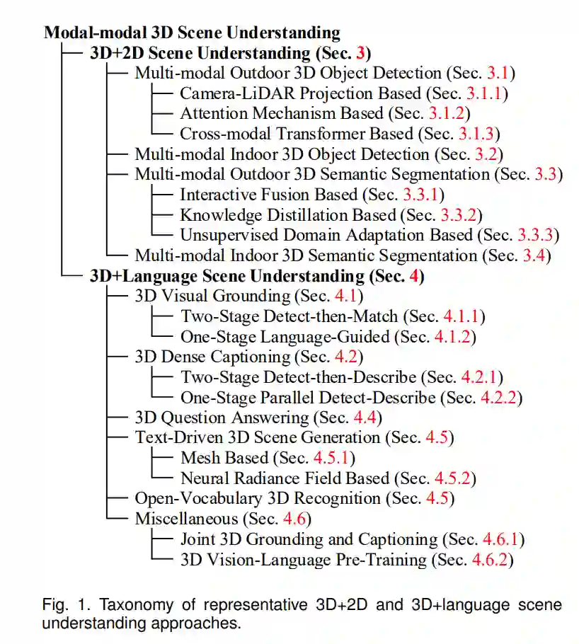 多模态3D场景理解可进一步分为:(1) 3D+2D场景理解。3D LiDAR点云提供了充足的深度和几何结构信息,这有助于获得3D物体的形状和姿态。但它们缺乏颜色信息和纹理细节,对于远距离的物体往往稀疏而无序[7], [8], [9], [10], [11]。相反,2D相机图像通常包含丰富的颜色、纹理和背景,但缺乏几何信息,且易受天气和光线条件的影响[12], [13], [14], [15]。自然地,利用LiDAR点云和相机图像之间的互补性可以更好地、更完整地感知3D环境。但这两种传感器捕获的同一个3D场景的表示之间经常会出现差异,因为LiDAR传感器通过360度旋转捕获点云,而相机从透视视图捕获图像,没有深度感[16]。为了解决这个问题,提出了一些3D+2D场景理解方法,通过基于几何的对齐[17]和基于语义的对齐[18]来进行LiDAR-相机融合。基于融合的特征,这些方法可以进一步执行3D物体检测和分割[19], [20], [21],这通常用于自动驾驶和机器人导航。(2) 3D+语言场景理解。传统的3D场景理解通常要求用户具有专业知识,这对普通用户不友好[22], [23], [24], [25], [26], [27]。用户现在期望有一种更便捷的方式将他们的意图传达给计算机,实现信息交换并获得个性化的结果。为了实现便捷的人机交互,研究人员提出了3D+语言场景理解。它结合3D视觉信息和自然语言作为输入[28], [29], [30],因为自然语言可以作为背景知识和查询条件来反映用户意图。通过多模态交互,经常采用如Transformer[31], [32]或图神经网络[33], [34]等技术,3D+语言场景理解方法不仅可以定位用户提到的实体(例如,视觉定位和开放词汇识别),还可以生成用户所需的内容(例如,密集字幕,视觉问题回答,场景生成)。