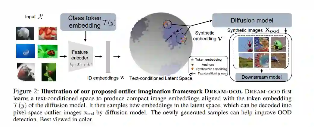 利用辅助的异常值数据集来规范机器学习模型对于检测分布外(OOD)数据和安全预测已展现出潜力。由于数据收集和清理的劳动强度,自动生成异常值数据一直是一个长期渴望的替代方案。尽管有吸引力,但在高维像素空间生成照片逼真的异常值一直是该领域的一个开放性挑战。为了解决这个问题,本文提出了一种新的框架DREAM-OOD,它能够通过扩散模型,仅使用分布内(ID)数据和类别,来想象照片逼真的异常值。具体来说,DREAM-OOD基于ID数据学习了一个文本条件的潜在空间,然后通过潜在在低可能性区域抽样异常值,这些可以通过扩散模型解码成图像。与以前的工作[18,98]不同,DREAM-OOD可以直接在像素空间中可视化和理解想象出来的异常值。我们进行了全面的定量和定性研究以理解DREAM-OOD的功效,并表明,使用DREAM-OOD生成的样本进行训练可以提高OOD检测性能。代码可在 https://github.com/deeplearning-wisc/dream-ood 公开获取。