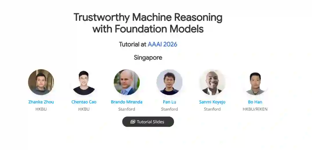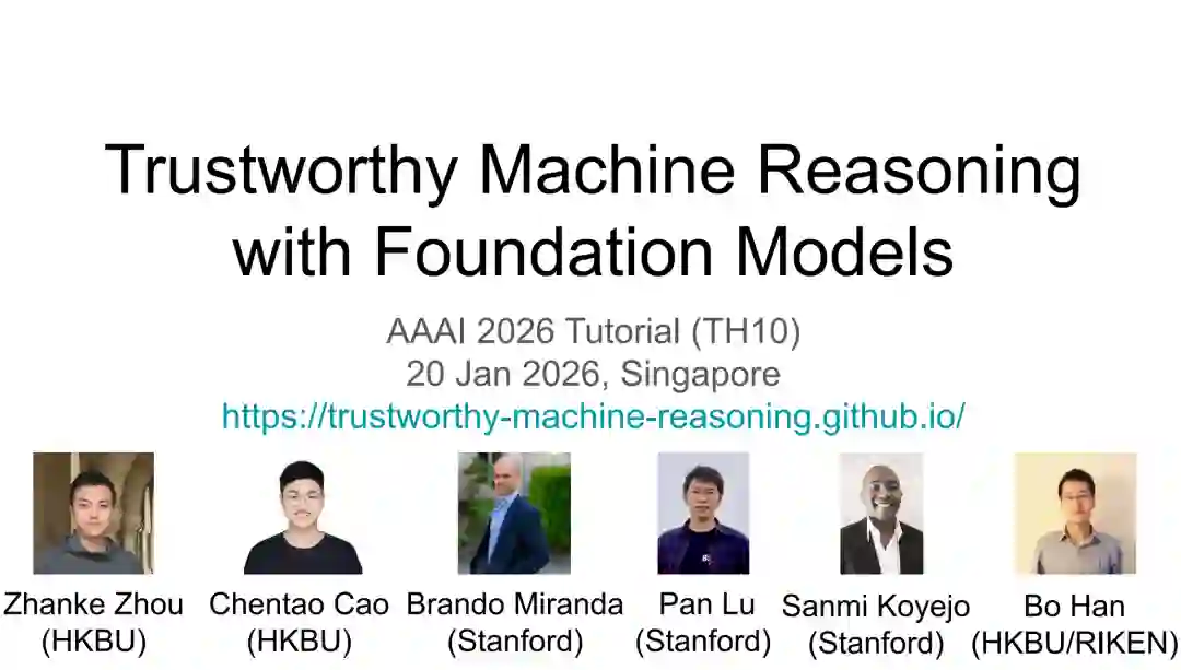 时间: 2026年1月20日,14:00地点: Peridot 202 * 第一部分:基础模型可信机器推理导论 (Bo Han, 30分钟) * 第二部分:基础模型可信机器推理技术 (Zhanke Zhou, 50分钟) * 第三部分:基础智能体可信机器推理技术 (Chentao Cao, 50分钟) * 第四部分:AI代码智能体可信机器推理应用 (Brando Miranda, 50分钟) * 总结致辞 (Zhanke Zhou, 10分钟) * 问答环节 (Q&A)