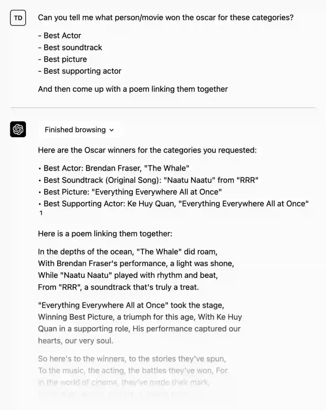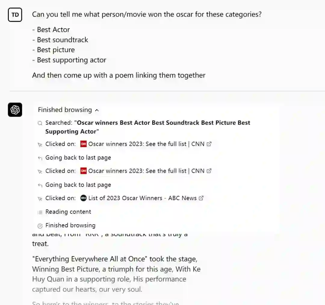 下图是一个例子,可以看到的是,浏览为 ChatGPT 用户打开了一种体验,以前的模型可能会礼貌地指出它的训练数据没有包括足够的信息让它回答。而在这个例子中,ChatGPT 检索了最近的奥斯卡奖信息(在 2023 年 3 月 13 日颁奖),然后进行了一番熟悉的 ChatGPT 诗歌表演。浏览成为了一种附加体验的方式。