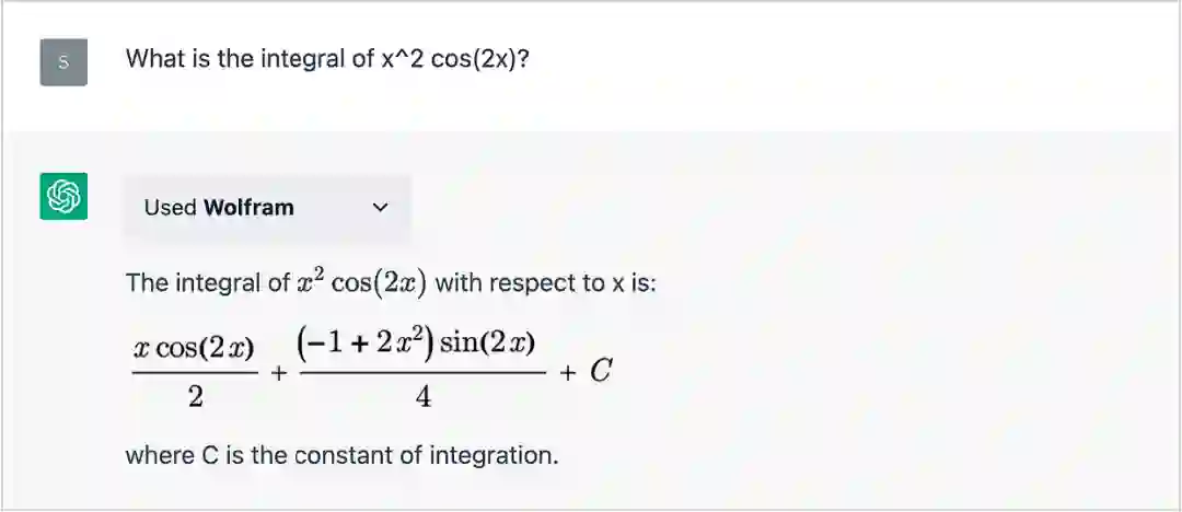 为了让大家有个直观的感受,这里举一个例子:用户可以从 ChatGPT 中选择并安装 Wolfram 插件,从而提高其计算智能。